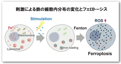 鉄イオンに依存した脂質過酸化物の蓄積により引き起こされるフェロトーシスがStockwellらに提唱されてから10年以上経過し、これまでにフェロトーシスに関する様々な研究がなされています。遊離した二価鉄 (Fe2+) がフェントン反応により活性酸素を発生させ、脂質が酸化されることから、フェロトーシスは鉄依存性の細胞死であることが明らかになってきています1)。また最近では、脂質酸化により、リソソームの膜が損傷し、リソソーム中の鉄が漏出することによって、他の細胞小器官へ脂質酸化が広がっていくことが報告されています2)。