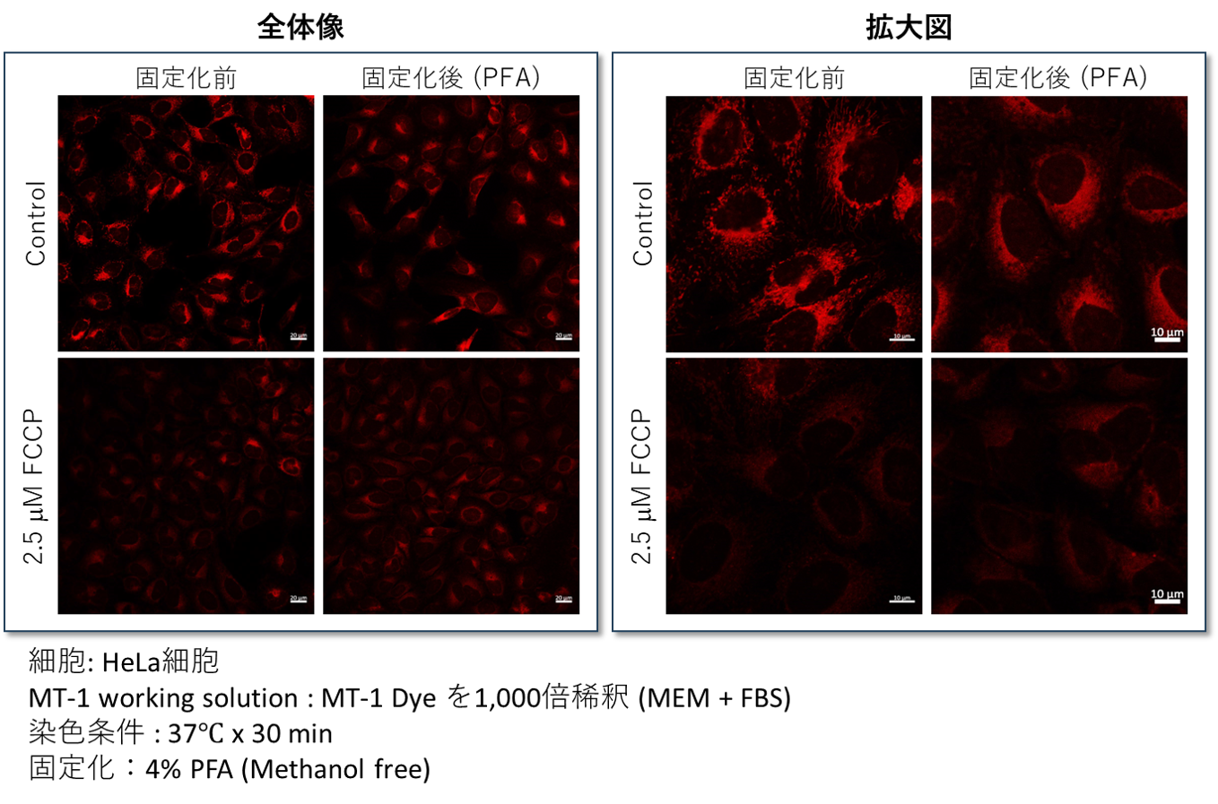 MT-1 は、染色後のPFA固定化操作を行っても蛍光が保持されるため、再現性の高い実験を行う事が可能です。