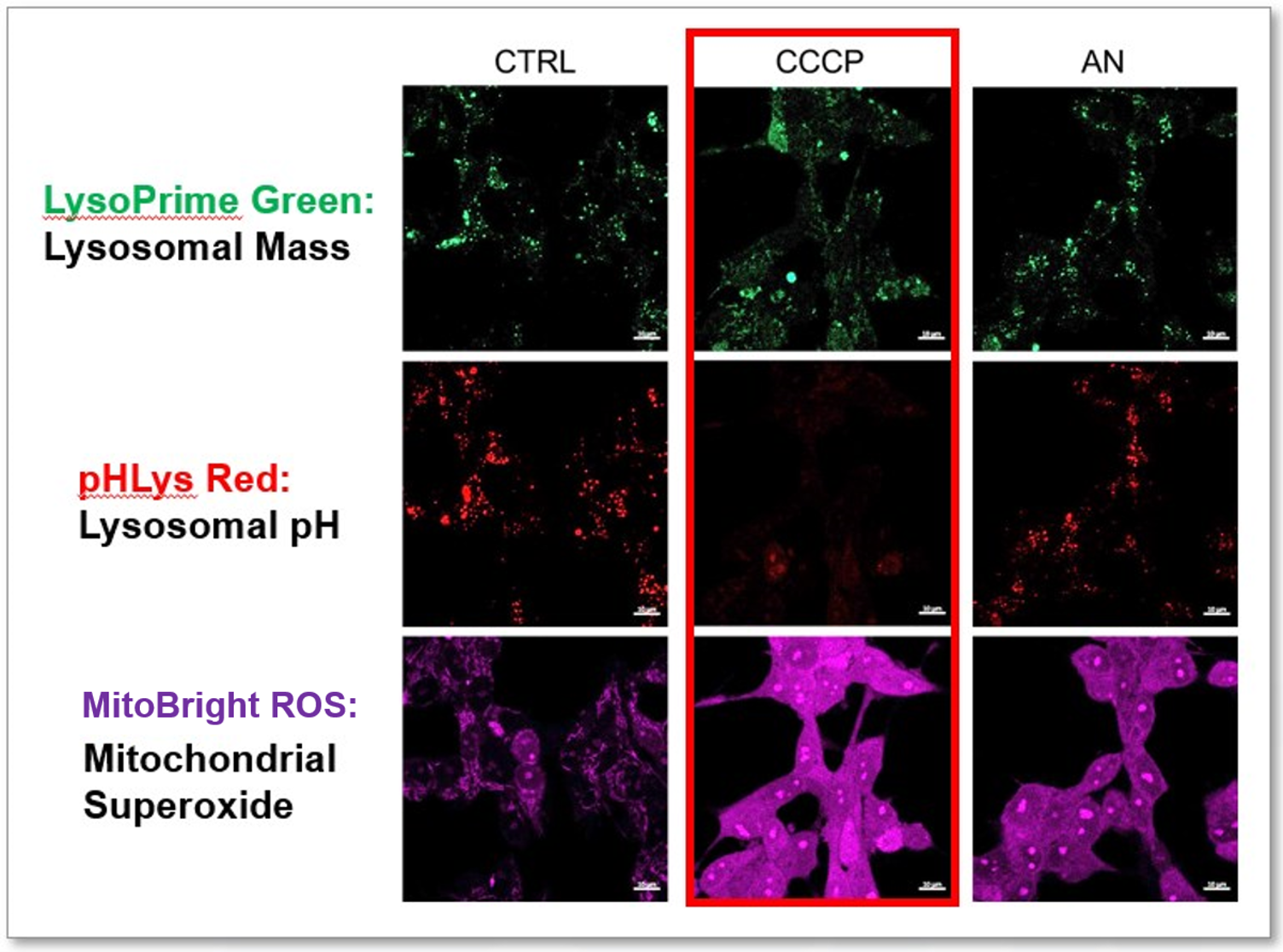 CCCPとアンチマイシン(AN)は、ミトコンドリア膜電位の喪失に関連するミトコンドリアROSの誘導因子として知られています。最近の研究では、CCCPはミトコンドリアROSだけでなく、リソソーム機能障害も誘発することが示されています。